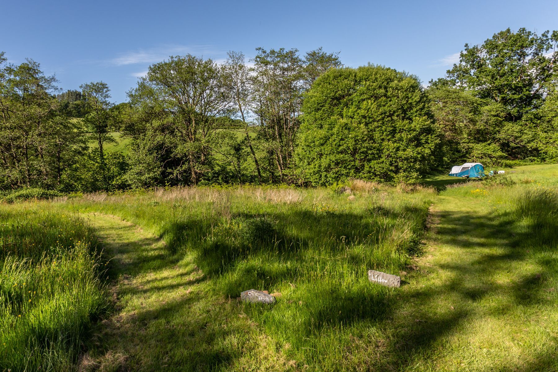 Tucked in along the riverbank, the Glade is a very special one acre woodland clearing next to the stream, with several pebble beaches and its own private access and compost toilet. It is surrounded by ancient oaks, superb alder coppice and hazel and has a mountain glimpse. It is very sheltered. Spend evenings looking up at the stars through the canopy and watching bats fly overhead. There are steep steps down to The Glade so you must be happy carrying your kit down. Plenty of room for more than one tent. Up to 6 people.